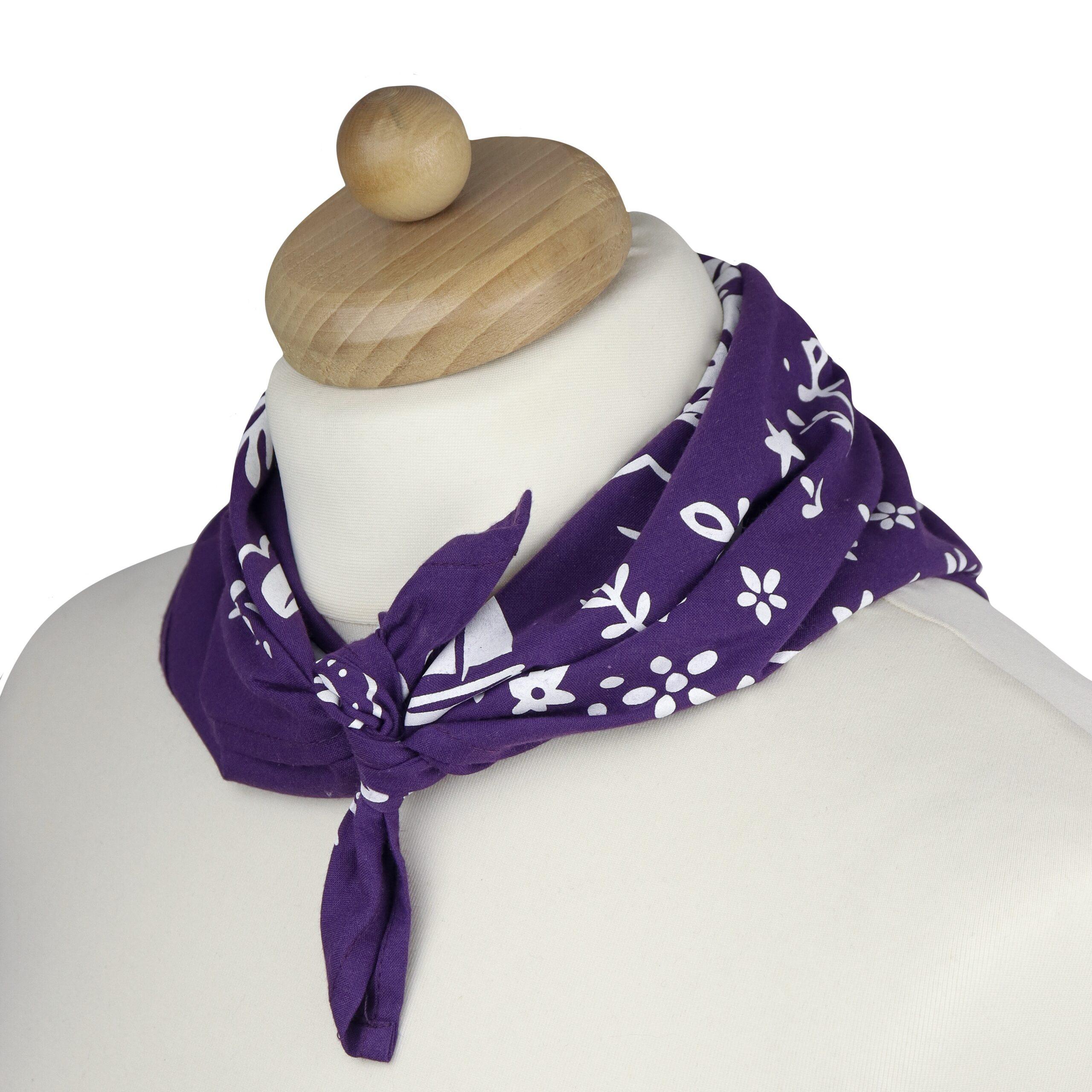 Śliwkowa bandana bawełniana 50 × 50 cm z białym nadrukiem sitodrukowym – idealna na wyjazd pracowniczy w wakacyjnym stylu. Bandana łączy w sobie praktyczność z unikalnym designem, idealnym dla firm chcących zadbać o profesjonalny i wakacyjny look swojego zespołu