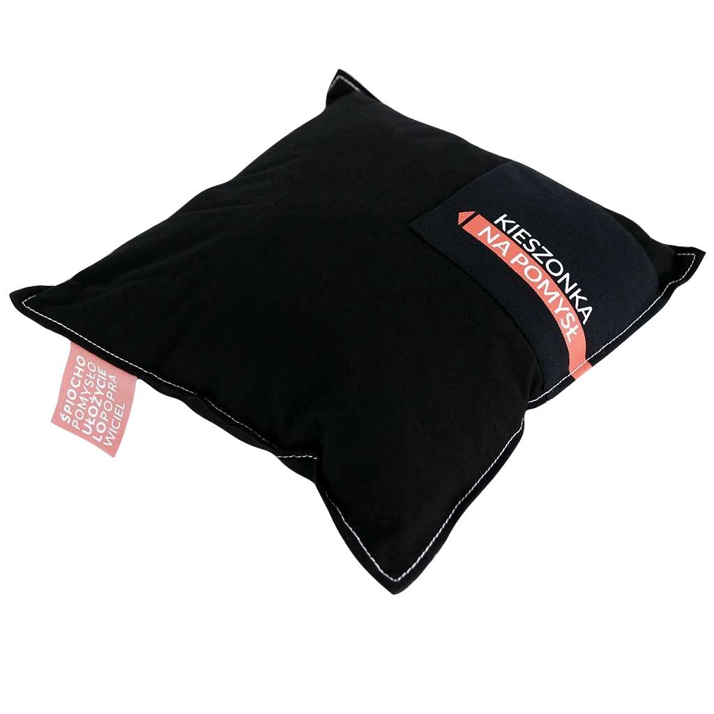 Wyjątkowa poszewka reklamowa z nietypowym pomysłem. Wykonana z czarnej bawełny, ma doszytą kieszonkę na pomysły oraz unikalną metkę wszytą w bok.